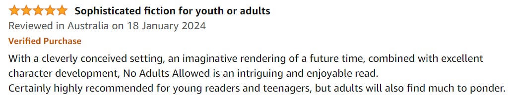 A couple of very pleasant surprises this week relating to my book No Adults Allowed. Amazon don’t tell authors when their books receive reviews, so I’d missed that one had been posted from Australia way back in January: